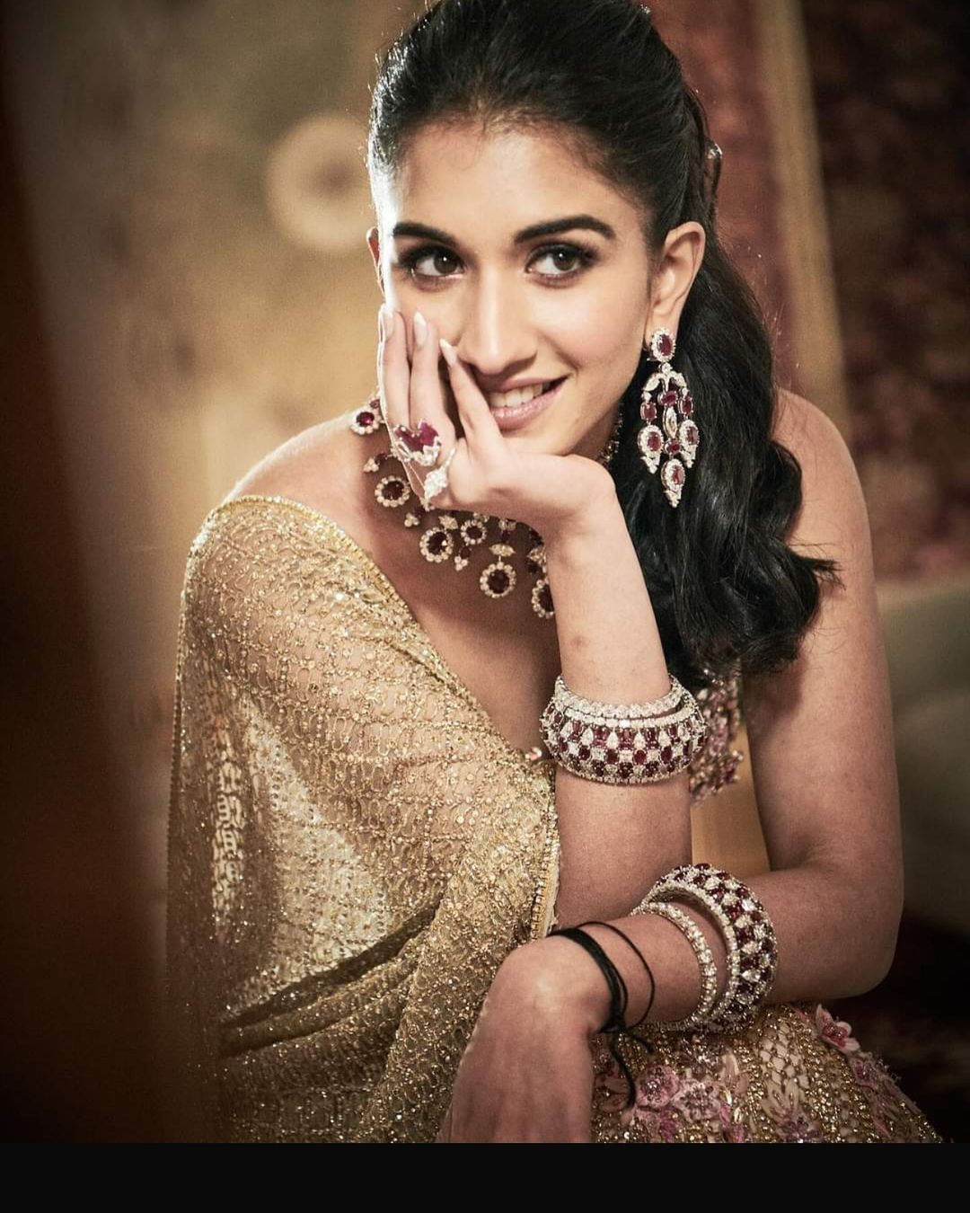 राधिका ने अपने लुक को पूरा करने के लिए डायमंड जड़ा हैवी हार, कान में भारी इयररिंग्स और हाथ में हीरे के जड़ाऊ कंगन पहने हैं| इसके साथ ही बालों को टाइट बांधकर पोनी की है|