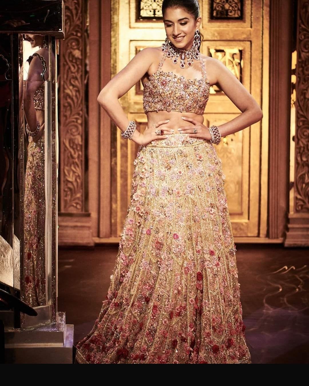 इस खूबसूरत से लहंगे में गोल्डन कलर से काम हुआ है साथ ही 25000 स्वारोस्की स्टोन जड़े हुए हैं| इसके साथ ही इसमें पिंक कलर के छोटे छोटे फूल लगे हुए हैं| ये फ़ूड 3 डी फ्लोरल है जो लहंगे में उभरे हुए दिख रहे हैं|