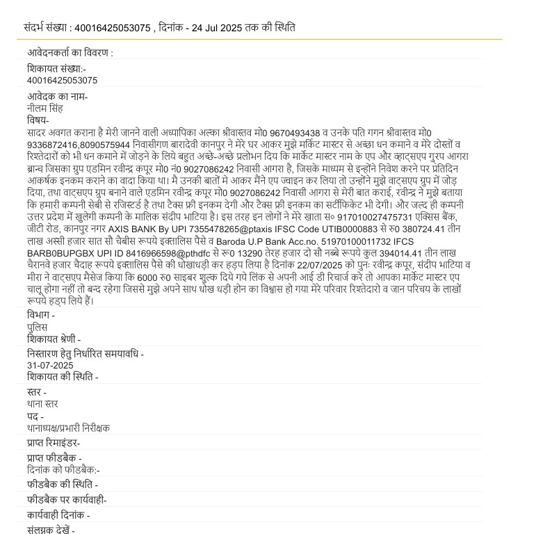 पीड़ित महिला ने इसकी शिकायत आईजीआरएस के माध्यम से मुख्यमंत्री से की है, जिसका जवाब आना शेष है। पीड़ित महिला ने बताया कि कानपुर के रवि, विनय, सीमा यादव, अनूप, नीलम सिंह, सानिया,अजय पाण्डे, स्वाति, लवी, सुनीता,नीतू शर्मा, प्रशांत, मणि पण्डित, मिर्नाज, मनोज, राजेश, शाहिद, वनिका, प्रवीण, अनस, शाहिद सकलेनी, अश्वनी, अन्नू, दिगंबर सिंह, राजेश, साहब आलम, निशा सिंह, कल्पना आदि लोग इसका शिकार हो गए हैं।