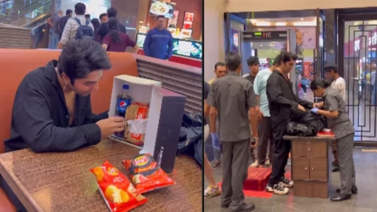 इस शख्स का नाम अल्फेश शेख है. वो पेशे से एक कंटेंट क्रिएटर हैं। वीडियो में देखा जा सकता है कि उन्होंने जूते का एक खाली बॉक्स टेबल पर रखा। फिर वो इसमें चिप्स, कोल्ड ड्रिंक और बर्गर समेत बाकी का सामान डालते हैं। इसके बाद बॉक्स पर टेप चिपका देते हैं। वो इस बॉक्स को अपने बैग में रखकर एंट्री लेते हैं। चेकिंग करवाते हैं। हैरत की बात ये है कि वो पकड़े भी नहीं जाते। वीडियो में दिखाई दे रहा है। कि वो एक्टर अक्षय कुमार की फिल्म ओएमजी 2 देखने गए थे. फिल्म देखते हुए वो थिएटर में खाने का मजा लेते हैं।