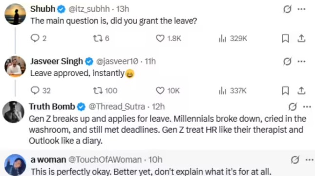 इस घटना ने एक गंभीर बहस को भी जन्म दिया है—क्या ब्रेकअप या मेंटल हेल्थ के कारण छुट्टी लेना भी उतना ही जरूरी है जितना किसी शारीरिक बीमारी के लिए? कई लोगों ने कहा कि नई पीढ़ी काम और निजी जीवन के बीच सीमाएं तय करने में पिछली पीढ़ियों से कहीं आगे है।