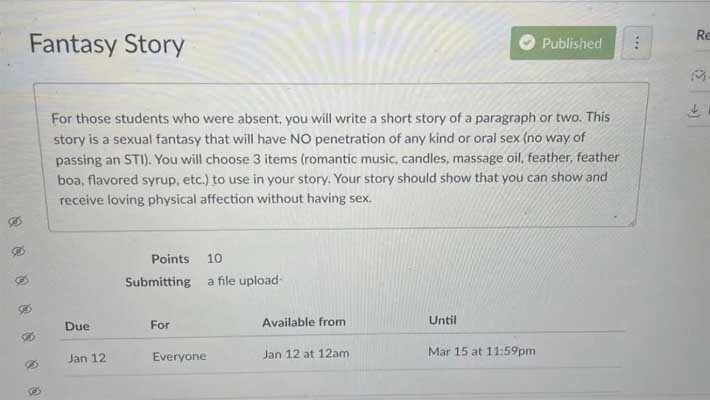 केन्यूज डेस्क:सेक्स एजुकेशन की आड़ में स्कूल ने सारी हदें को पार कर दिया,यहां एक कक्षा में अनुपस्थित छात्र को अध्यापक ने सेक्स फेंटेसी पर निबंध लिखने को दे दिया,सीमा तब पार हुई जब अध्यापक ने सेक्स संबधित खिलौने का भी इस्तेमाल करने की बात कही,जब निबंध के बारे में छात्र के परिजनों को मालूम चला तो जमकर विवाद हुआ.