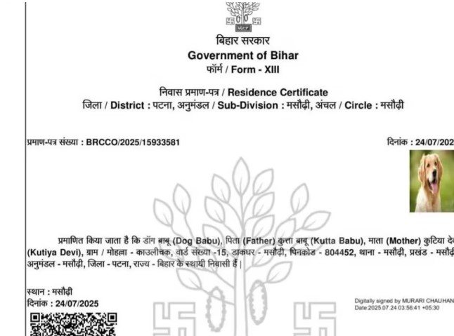 शिव शंकर सविता- बिहार की राजधानी पटना में एक अजीबो-गरीब मामला सामने आया है, जहां सरकारी कर्मचारियों ने गैर-जिम्मेदाराना तरीके से एक कुत्ते का आवास प्रमाणपत्र जारी कर दिया। मामला प्रकाश में आते ही हड़कंप मच गया। जिसके बाद जिलाधिकारी ने मामले की जांच के बाद संबंधित पर कार्रवाई के आदेश दिए हैं। मामला पटना के मसौढ़ी अंचल कार्यालय का बताया जा रहा है। यहां पर आरटीपीएस कांउटर ने एक कुत्ते की फोटो लगा आवास प्रमाण पत्र जारी कर दिया। जारी आवास प्रमाणपत्र में राजस्व पदाधिकारी मुरारी चौहान के डिजिटल हस्ताक्षर भी हैं।