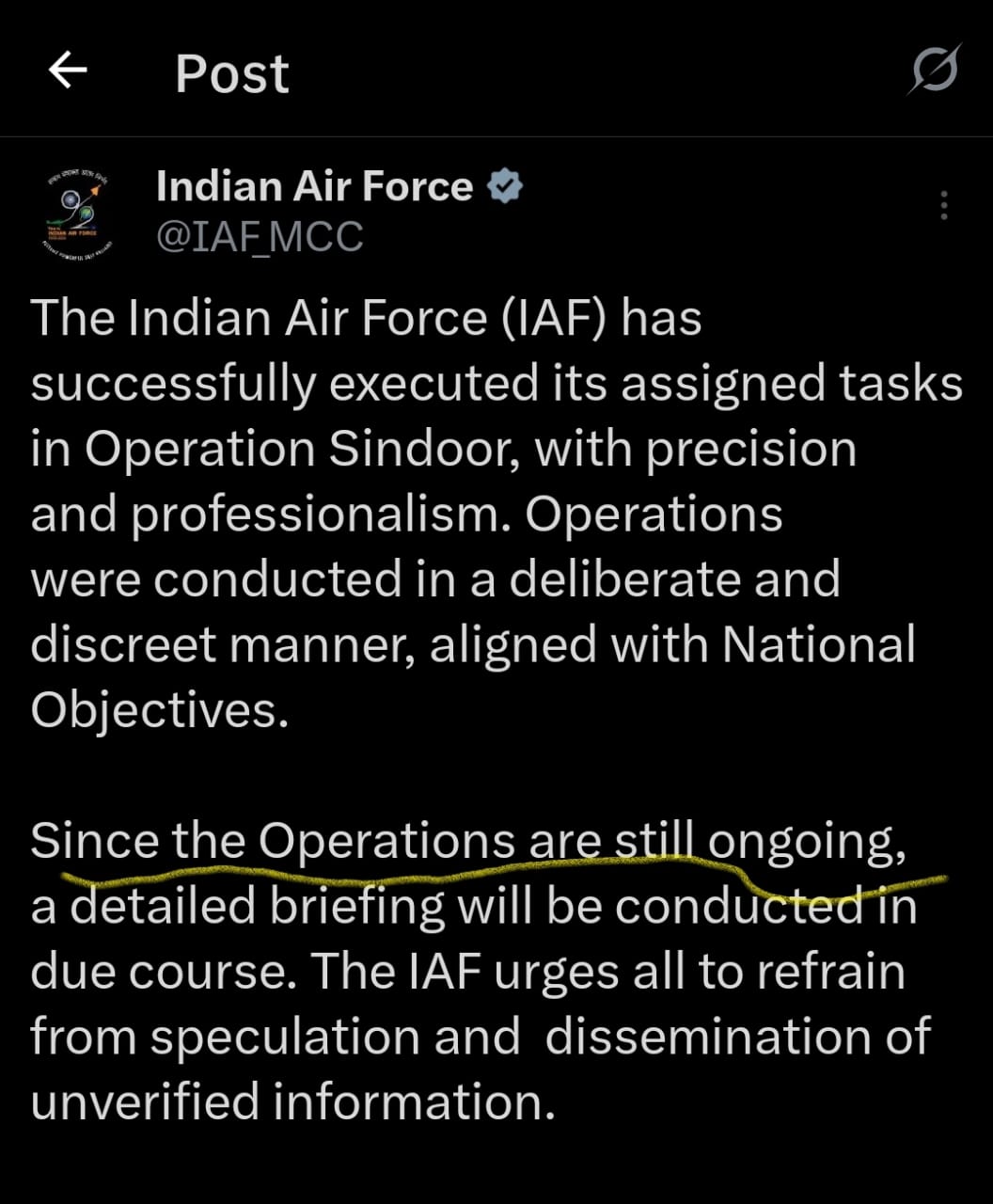 भारतीय वायुसेना ने अपने आधिकारिक ट्विटर हैंडल में लिखा कि भारतीय वायु सेना (IAF) ने ऑपरेशन सिंदूर में अपने सौंपे गए कार्यों को सटीकता और व्यावसायिकता के साथ सफलतापूर्वक अंजाम दिया है। ऑपरेशन राष्ट्रीय उद्देश्यों के अनुरूप सोच-समझकर और विवेकपूर्ण तरीके से संचालित किए गए। चूंकि ऑपरेशन अभी भी जारी है, इसलिए समय रहते विस्तृत जानकारी दी जाएगी। IAF सभी से अपील करता है कि वे अटकलें लगाने और असत्यापित जानकारी के प्रसार से बचें।