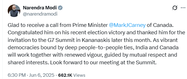 पीएम नरेन्द्र मोदी ने सोशल मीडिया प्लेटफार्म एक्स पर लिखा कि कनाडा के प्रधानमंत्री @MarkJCarney से फोन पर बात करके खुशी हुई। हाल ही में हुए चुनाव में उनकी जीत पर उन्हें बधाई दी और इस महीने के अंत में कनानसकीस में होने वाले G7 शिखर सम्मेलन में आमंत्रित करने के लिए उन्हें धन्यवाद दिया। गहरे जन-जन संबंधों से बंधे जीवंत लोकतंत्रों के रूप में, भारत और कनाडा आपसी सम्मान और साझा हितों के मार्गदर्शन में नए जोश के साथ मिलकर काम करेंगे। शिखर सम्मेलन में हमारी मुलाकात का बेसब्री से इंतजार है।