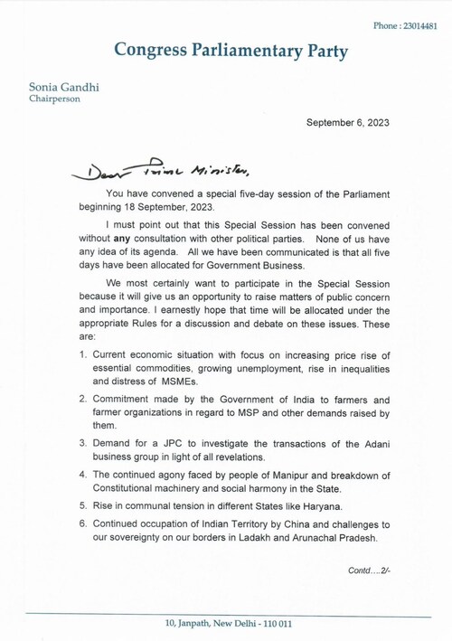 अपने पत्र में सोनिया गांधी ने लिखा, “आपने एक विशेष पांच दिवसीय सत्र बुलाया है, जो 18 सितंबर 2023 से शुरू होने वाला है। मैं आपको ध्‍यान दिलाना चाहती हूं कि यह विशेष सत्र अन्य राजनीतिक दलों के साथ किसी भी परामर्श के बिना बुलाया गया है। हम में से किसी के पास भी इसे लेकर एजेंड उपलब्‍ध नहीं है.’ विपक्ष को केवल यह जानकारी मिली थी कि ‘सरकारी कामकाज’ के लिए संसद के पांच दिन आवंटित किए गए हैं। सोनिया गांधी ने अपने पत्र में विपक्ष के नौ सूत्री एजेंडे को भी पीएम मोदी के समक्ष रखा। पत्र में कहा गया कि वो इस पांच दिवसीय सत्र के दौरान महंगाई, मणिपुर हिंसा, हरियाणा  में हिंसा जैसे मुद्दों पर चर्चा चाहती हैं।
