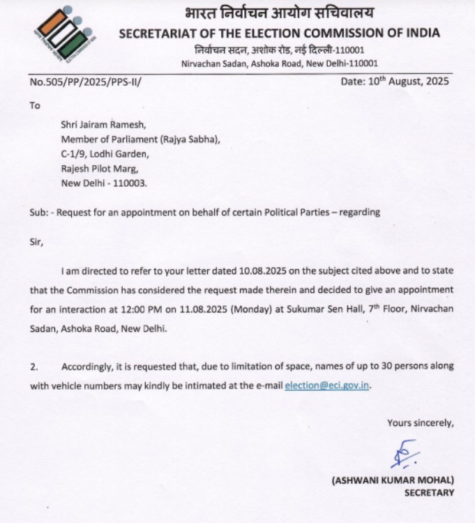 निर्वाचन आयोग की तरफ से भेजे पत्र में कहा गया है कि आपके दिनांक 10.08.2025 के पत्र का संदर्भ देने और यह बताने का निर्देश हुआ है कि आयोग ने उसमें किए गए अनुरोध पर विचार किया है और दोपहर 12:00 बजे बातचीत के लिए समय देने का निर्णय लिया है। पत्र में आगे कहा गया कि स्थान की कमी के कारण, कृपया वाहन संख्या सहित अधिकतम 30 व्यक्तियों के नाम election@eci.gov.in पर ई-मेल पर सूचित करें। यह मीटिंग निर्वाचन सदन के सुकुमार हॉल में होगी।