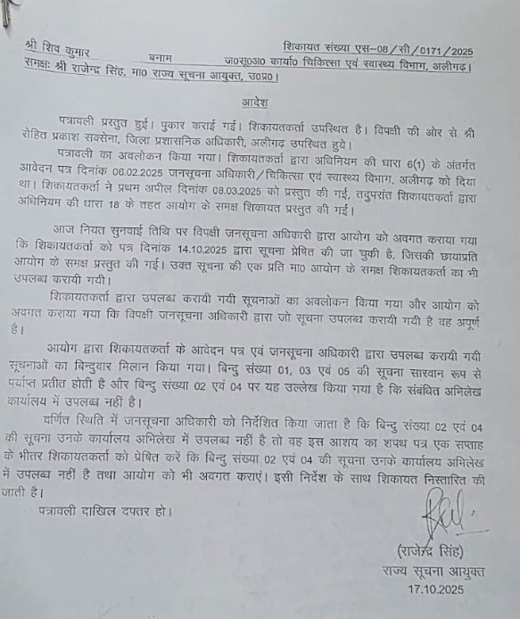 डिजिटल डेस्क- अलीगढ़ के स्वास्थ्य विभाग में बड़ी लापरवाही का मामला सामने आया है। वर्ष 2012 में हुई 118 संविदा कर्मियों, जिनमें 30 डॉक्टर भी शामिल थे, की नियुक्तियों से जुड़ा पूरा रिकॉर्ड रहस्यमय तरीके से गायब हो गया है। जैसे ही इन नियुक्तियों की जानकारी जन सूचना अधिकार (RTI) के तहत मांगी गई, विभाग में अफरा-तफरी मच गई। सीएमओ कार्यालय में जब फाइलें खोजी गईं तो पता चला कि संबंधित पत्रावलियां ही नहीं मिल रही हैं। शिकायतकर्ता शिवकुमार ने शासन से यह जानना चाहा था कि उस समय चयन समिति में कौन-कौन अधिकारी शामिल थे और इन नियुक्तियों के विज्ञापन कहां प्रकाशित किए गए थे। उन्होंने कुल पांच बिंदुओं पर जानकारी मांगी थी, लेकिन विभाग ने केवल दो सवालों के जवाब दिए और बाकी तीन पर चुप्पी साध ली। जब शासन स्तर से जवाब तलब हुआ, तब जाकर विभाग में पुराने रिकॉर्ड खंगालने का सिलसिला शुरू हुआ। हालांकि, छह महीने से खोजबीन के बावजूद कोई दस्तावेज नहीं मिला है।