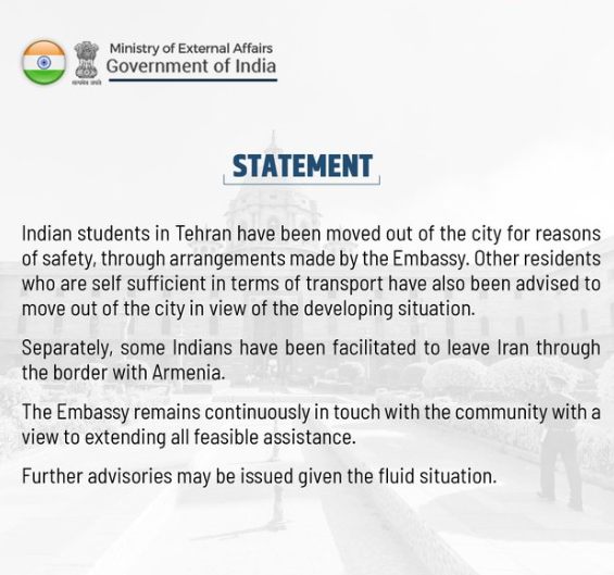 युद्ध के चलते जारी एडवाइजरी में विदेश मंत्रालय की तरफ से कहा गया है कि तेहरान में भारतीय छात्रों को दूतावास की ओर से की गई व्यवस्था के माध्यम से सुरक्षा कारणों से शहर से बाहर निकाल दिया गया है। परिवहन के मामले में आत्मनिर्भर अन्य निवासियों को भी शहर से बाहर जाने की सलाह दी गई है। इसके अलावा कुछ भारतीयों को आर्मेनिया की सीमा के माध्यम से ईरान छोड़ने की सुविधा दी गई है। दूतावास सभी संभव सहायता प्रदान करने के उद्देश्य से समुदाय के साथ लगातार संपर्क में है।