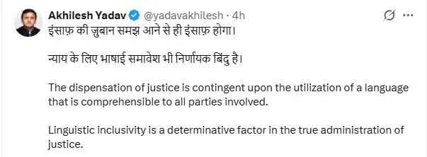 अखिलेश यादव ने सोशल मीडिया पर पोस्ट करते हुए कहा कि इंसाफ की जुबान समझ आने से ही इंसाफ होगा। उन्होंने जोर दिया कि न्याय के लिए भाषाई समावेश एक निर्णायक बिंदु है। उनके मुताबिक, अदालतों में उस भाषा का इस्तेमाल होना चाहिए, जिसे न्याय की आस लगाए व्यक्ति आसानी से समझ पाए।