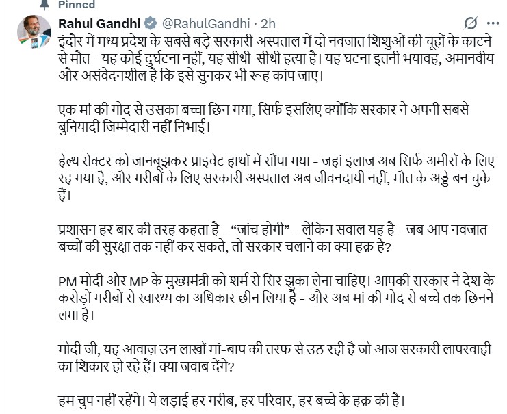 इंदौर अस्पताल में नवजातों की मौत पर राहुल गांधी का हमला, बोले– यह हादसा नहीं, हत्या है