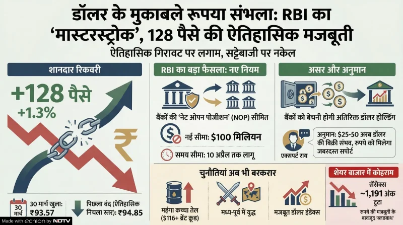 Rupee vs Dollar: RBI के सख्त कदम से रुपये की जोरदार वापसी, 128 पैसे उछलकर 93.57 पर पहुंचा