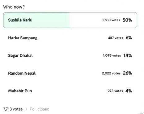 जेनरेशन-जेड के प्रतिनिधियों ने इस ऑनलाइन सर्वे के नतीजे राष्ट्रपति पौडेल को सौंपे और उनकी पैरवी पर ही कार्की को अंतरिम प्रधानमंत्री बना दिया गया। कार्की को छह महीने के भीतर आम चुनाव कराने और निष्पक्ष सरकार का संचालन करने की जिम्मेदारी दी गई है।