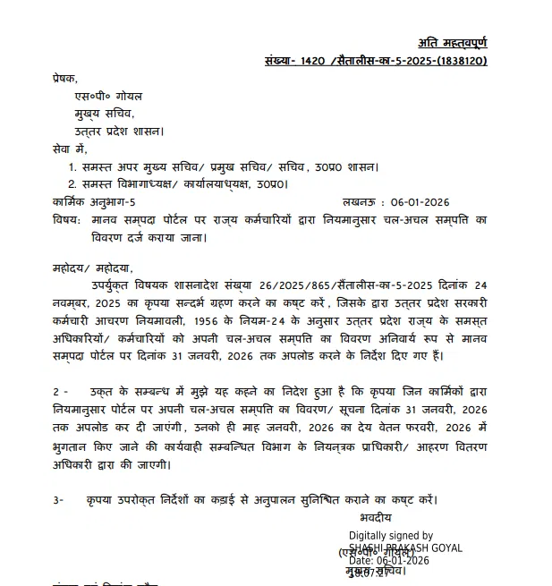 सरकार के आदेश के मुताबिक, 31 दिसंबर 2025 तक अर्जित सभी चल-अचल संपत्तियों का विवरण 31 जनवरी 2026 तक मानव संपदा पोर्टल पर अपलोड करना होगा। यदि कोई कर्मचारी तय समय सीमा के भीतर यह जानकारी नहीं देता है, तो फरवरी माह में जनवरी का वेतन रोक दिया जाएगा।