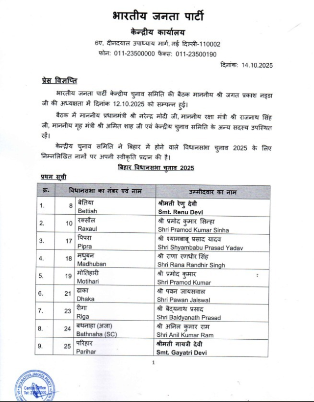 KNEWS DESK- बिहार विधानसभा चुनाव को लेकर भारतीय जनता पार्टी (BJP) ने अपने चुनावी अभियान का बिगुल फूंक दिया है। पार्टी ने शनिवार को पहली सूची जारी कर दी, जिसमें कुल 71 उम्मीदवारों के नाम शामिल हैं। इस लिस्ट में कई वरिष्ठ और चर्चित चेहरों को दोबारा मैदान में उतारा गया है।