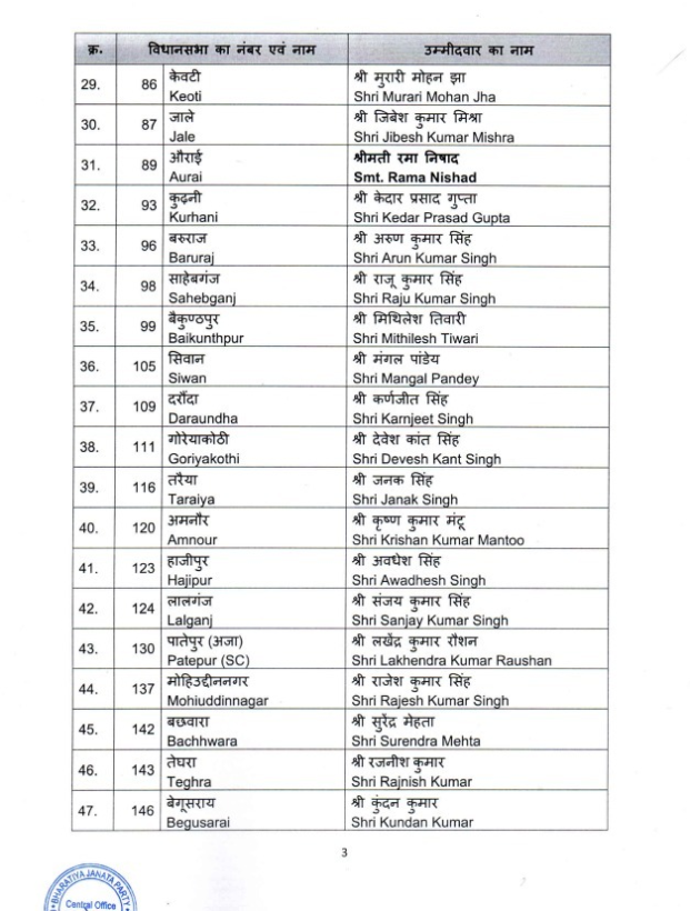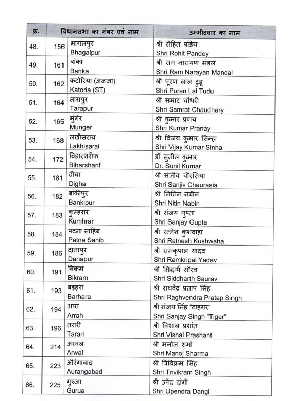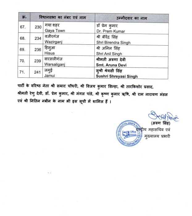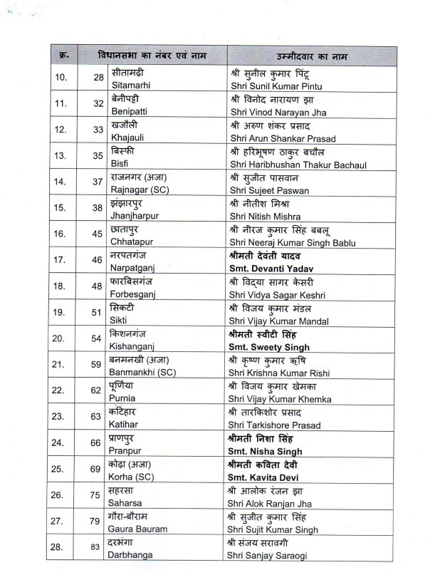 हालांकि अभी जेडीयू (JDU), हम (HAM) और अन्य एनडीए सहयोगियों की ओर से लिस्ट आनी बाकी है।
