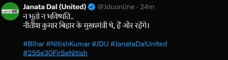 जेडीयू ने अपने आधिकारिक एक्स हैंडल से पोस्ट करते हुए कहा— “न भूतो न भविष्यति… नीतीश कुमार बिहार के मुख्यमंत्री थे, हैं और रहेंगे।” इस ट्वीट को जेडीयू ने कुछ देर बाद हटा दिया, लेकिन तब तक यह वायरल हो चुका था और राजनीतिक चर्चाओं का केंद्र बन गया। जेडीयू का यह संदेश साफ दर्शाता है कि पार्टी अभी भी नीतीश कुमार को एनडीए का निर्विवाद नेता मानती है, चाहे बीजेपी कितनी भी सीटों पर आगे क्यों न हो। मौजूदा चुनाव में जेडीयू और बीजेपी दोनों 101–101 सीटों पर चुनाव मैदान में उतरे थे, यानी सीट बंटवारा बराबर था। लेकिन जैसे-जैसे रुझान सामने आए, बीजेपी का ग्राफ जेडीयू से ऊँचा दिखा। ऐसे में यह सवाल उठ रहा है कि क्या अधिक सीटें जीतकर बीजेपी मुख्यमंत्री पद पर अपनी दावेदारी मजबूत करने की कोशिश कर सकती है।