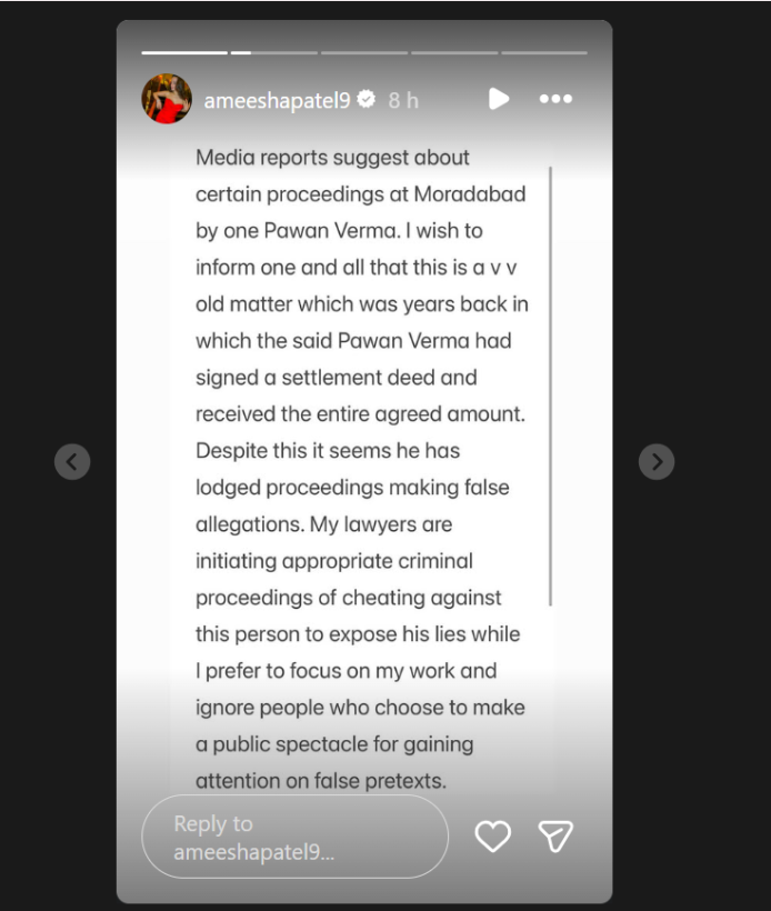 Ameesha Patel ने इस पूरे विवाद पर सोशल मीडिया के जरिए अपनी प्रतिक्रिया दी है। उन्होंने इंस्टाग्राम पोस्ट में लिखा कि यह कई साल पुराना मामला है और उस समय दोनों पक्षों के बीच समझौता हो चुका था।