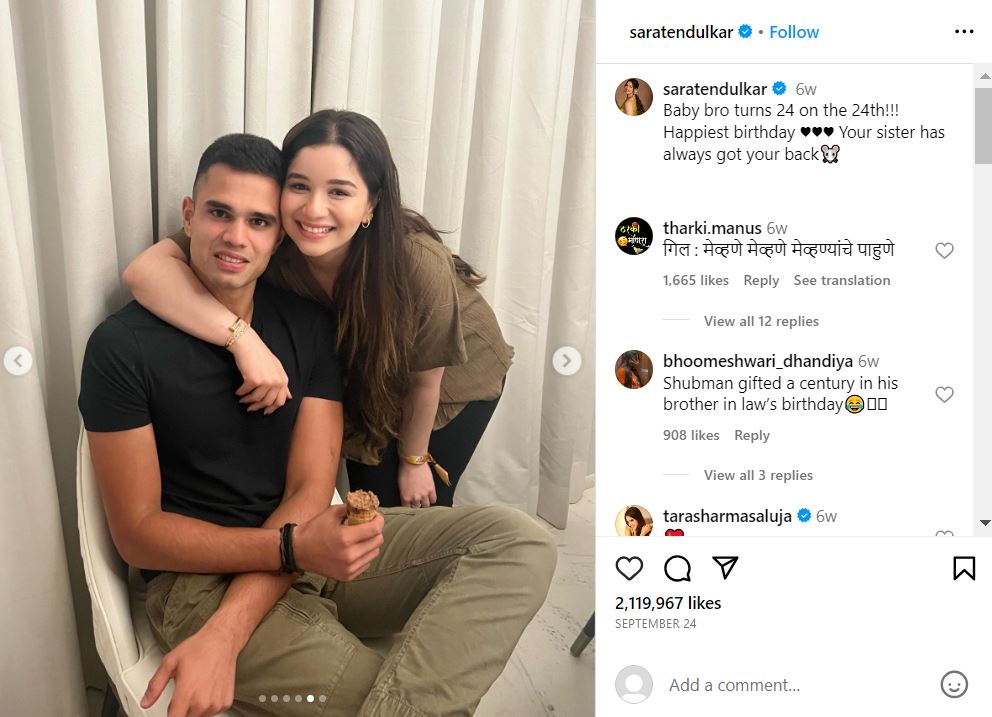 सारा तेंदुलकर की इस फोटो में उनके साथ चेयर पर बैठा शख्स कोई और नहीं, बल्कि उनके छोटे अर्जुन तेंदुलकर हैं। इन फोटोज को खुद सारा तेंदुलकर ने 24 सितंबर को क्रिकेटर अर्जुन तेंदुलकर के जन्मदिन के मौके पर शेयर करते हुए बधाई दी थी।