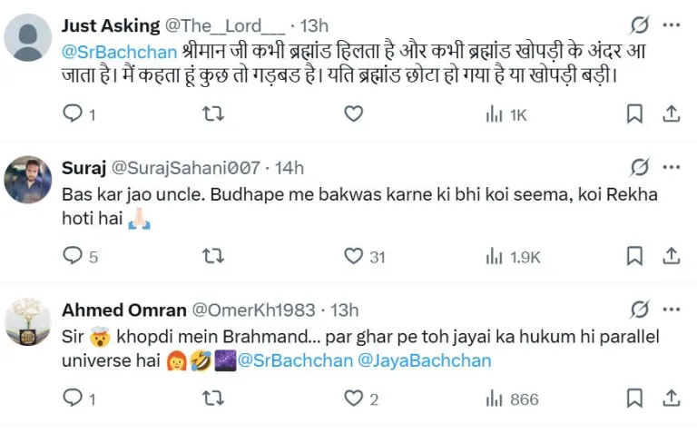 गौरतलब है कि अमिताभ बच्चन ने ब्रह्मांड को लेकर एक दिन पहले भी एक्स पर पोस्ट किया था। 8 अक्टूबर की देर रात ढाई बजे उन्होंने लिखा था, “ऊपर देखा, इधर उधर देखा- पूरा ब्रह्मांड हिल गया।” उस समय भी उनके पोस्ट को लेकर सोशल मीडिया पर मज़ेदार प्रतिक्रियाएं और ट्रोलिंग हुई थी।