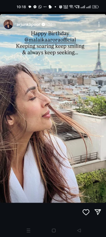 अर्जुन कपूर ने अपनी इंस्टाग्राम स्टोरी पर मलाइका की एक फोटो शेयर की, जिसमें वह वेदर का आनंद लेते हुए मुस्कुराती नजर आ रही हैं। अर्जुन ने पोस्ट के साथ लिखा, “हैप्पी बर्थडे मलाइका। उड़ते रहो, मुस्कुराते रहो और हमेशा खोजते रहो।” इस पोस्ट के बाद फैंस के बीच चर्चा तेज हो गई कि क्या अर्जुन और मलाइका के बीच पैचअप हो गया है।