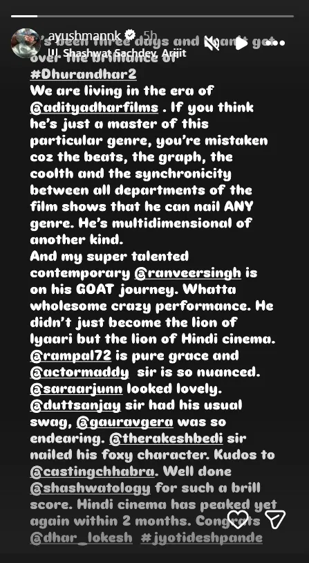 आयुष्मान ने इंस्टाग्राम स्टोरी पर फिल्म और इसके निर्देशक आदित्य धर की जमकर तारीफ की। उन्होंने लिखा कि फिल्म देखने के तीन दिन बाद भी वह इसकी कहानी और प्रभाव से बाहर नहीं निकल पाए हैं।