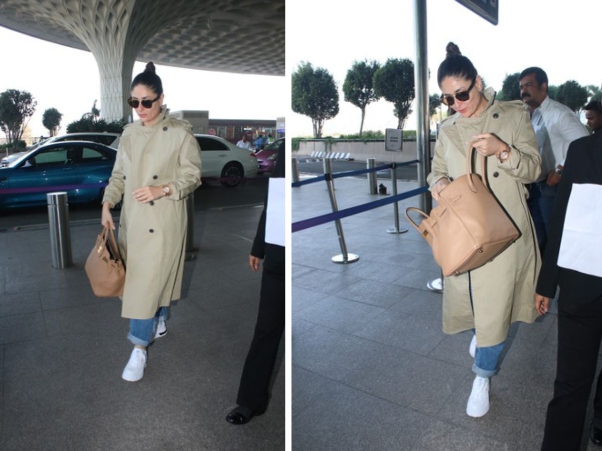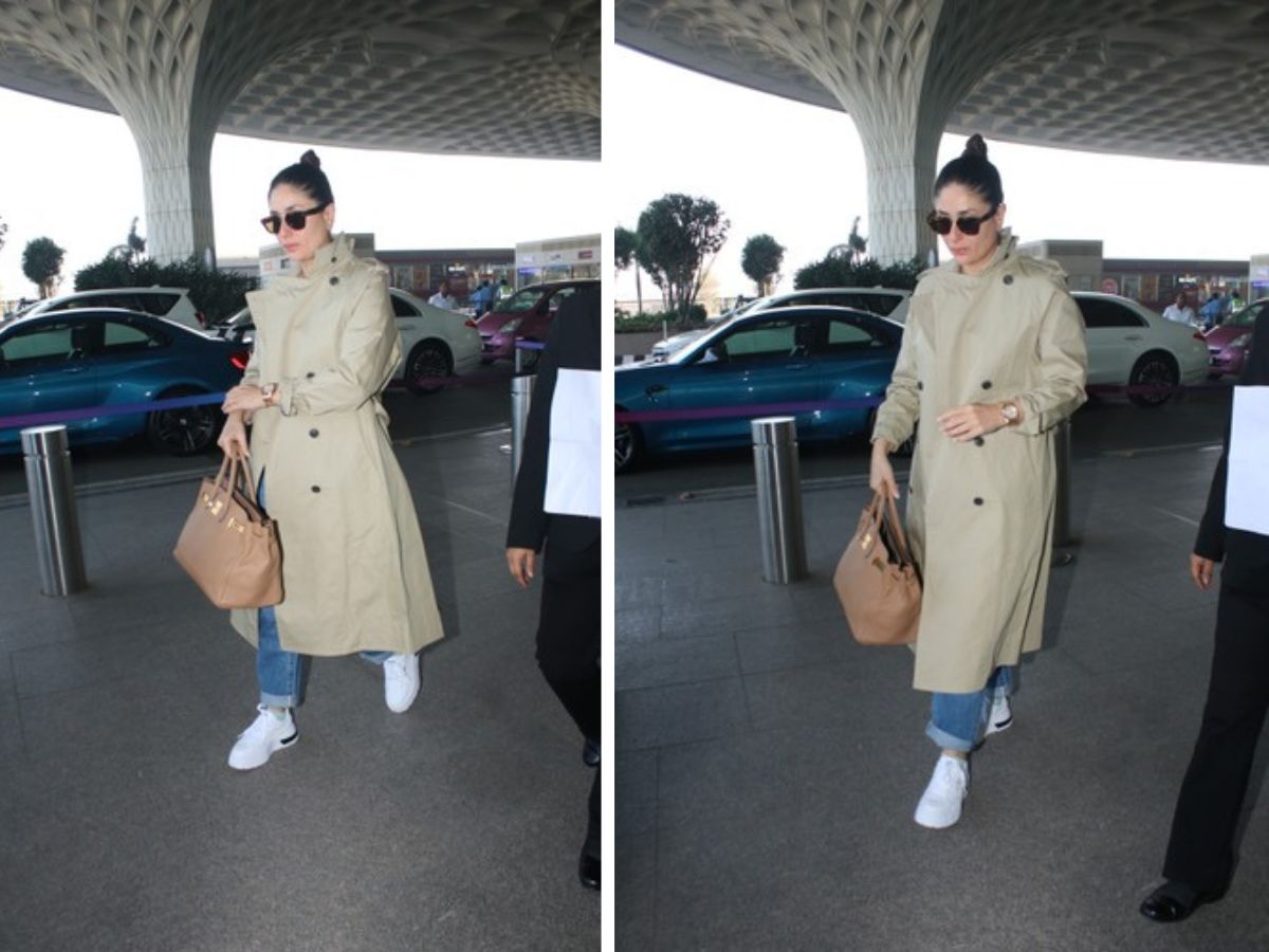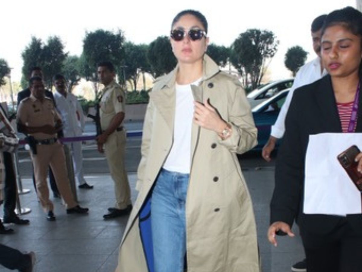 एक्ट्रेस करीना कपूर खान को ब्लू डेनिम ट्राउजर, व्हाइट टी-शर्ट और बेज लॉन्ग कोट में देखा गया। उन्होंने अपने आउटफिट को व्हाइट स्नीकर्स और शेड्स से कंप्लीट किया।