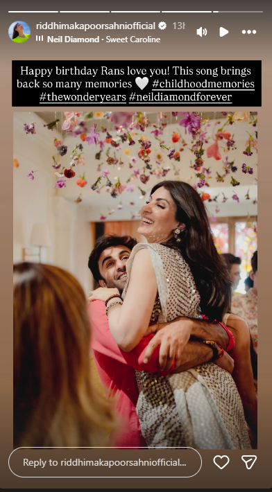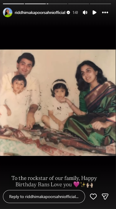 रणबीर की बहन रिद्धिमा कपूर साहनी ने भी भाई को बर्थडे विश करने में कोई कसर नहीं छोड़ी। उन्होंने इंस्टाग्राम पर एक फैमिली फोटो पोस्ट की और लिखा – “हमारे परिवार के रॉकस्टार को जन्मदिन की हार्दिक शुभकामनाएं, रेंस, आपसे प्यार करती हूं।” इसके अलावा रिद्धिमा ने एक पुरानी तस्वीर भी साझा की, जिसमें रणबीर उन्हें गोद में लिए नजर आ रहे हैं। इस तस्वीर ने भाई-बहन के रिश्ते की मिठास को और भी खास बना दिया।