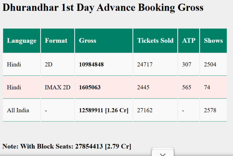 ‘धुरंधर’ की एडवांस बुकिंग IMAX 2D और 2D दोनों फॉर्मेट्स में शुरू की गई है, और शुरुआती ट्रेंड देखकर अंदाजा लगाया जा सकता है कि यह फिल्म ओपनिंग वीकेंड में बड़ा धमाका कर सकती है।