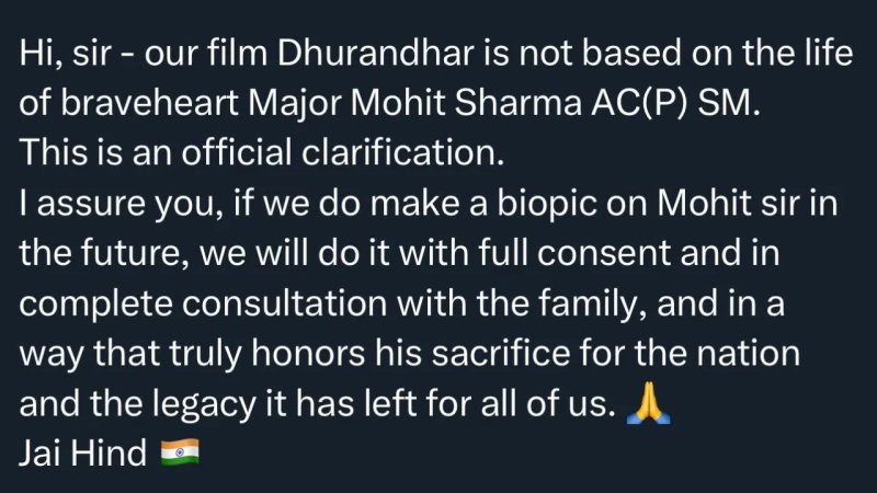 विवाद बढ़ने पर डायरेक्टर आदित्य धर ने सोशल मीडिया पर आधिकारिक बयान जारी किया। उन्होंने स्पष्ट किया, “हमारी फिल्म ‘धुरंधर’ मेजर मोहित शर्मा के जीवन पर आधारित नहीं है। यह एक पूरी तरह से काल्पनिक कहानी है। यदि भविष्य में हम मेजर मोहित शर्मा पर कोई बायोपिक बनाते हैं, तो इसे परिवार की सहमति और उनकी पूरी भागीदारी के साथ बनाया जाएगा।” धार ने यह भी कहा कि फिल्म में दिखाया गया कोई भी पहलू किसी वास्तविक घटना या व्यक्ति पर आधारित नहीं है।