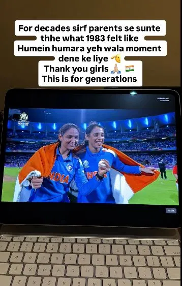 श्रद्धा ने इंस्टाग्राम स्टोरी पर हरमनप्रीत कौर और स्मृति मंधाना की तिरंगे के साथ जश्न मनाती तस्वीर शेयर करते हुए लिखा, “कई दशकों से पैरेंट्स से सुनते थे कि 1983 के वक्त कैसा महसूस होता था… हमें हमारा ये वाला मोमेंट देने के लिए थैंक्यू लड़कियों. ये कई पीढ़ियों के लिए है।” उनकी ये पोस्ट सोशल मीडिया पर खूब वायरल हो रही है. फैंस भी श्रद्धा की तरह टीम इंडिया की इस जीत को “ऐतिहासिक” बता रहे हैं.