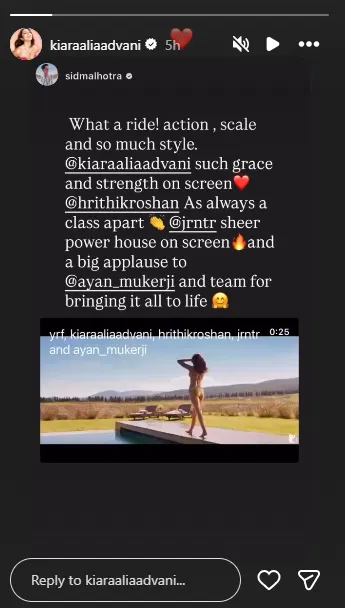सिद्धार्थ मल्होत्रा ने इंस्टाग्राम स्टोरी पर फिल्म की तारीफ करते हुए लिखा,“क्या सफर है! एक्शन, स्केल और इतना सारा स्टाइल. कियारा आडवाणी स्क्रीन पर ग्रेस और इतनी ताकत लेकर आई हैं.” ऋतिक रोशन पर उन्होंने कहा – “हमेशा की तरह एक अलग क्लास में हैं.” जूनियर एनटीआर के लिए उन्होंने लिखा – “स्क्रीन पर एनटीआर एक पावरहाउस हैं.”