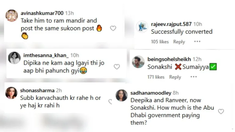 फोटोज के वायरल होते ही ट्रोलर्स ने सोनाक्षी और जहीर पर जमकर कमेंट किए। कुछ यूजर्स ने लिखा, “करवाचौथ कर रहे हो या हज?”, “दीपिका ने कम आग लगाई थी, अब आप भी पहुंच गईं।”, “सुकून के लिए अपने पति को राम मंदिर भी लेकर जाओ।”, “अबू धाबी की सरकार इन लोगों को कितना पैसा दे रही है?”