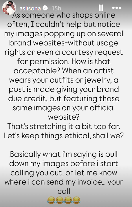 सोनाक्षी ने अपनी इंस्टाग्राम स्टोरी में लिखा, “मैं खुद भी ऑनलाइन शॉपिंग करती हूं और कई बार अपनी तस्वीरें ब्रांड्स की वेबसाइट्स पर देखती हूं। इनमें न तो मुझे क्रेडिट दिया जाता है और न ही मेरी परमिशन ली जाती है। जब कोई आर्टिस्ट आपके कपड़े या ज्वेलरी पहनता है तो आपको पोस्ट में सही क्रेडिट दिया जाता है। लेकिन उन्हीं तस्वीरों को उठाकर अपनी वेबसाइट पर डाल देना ठीक नहीं। इसे थोड़ा नैतिक रखिए। मेरी तस्वीरें तुरंत हटाइए, वरना मुझे नाम लेकर बोलना पड़ेगा।” सोनाक्षी की ये पोस्ट सोशल मीडिया पर वायरल हो गई है और फैंस उनके इस सख्त स्टैंड की तारीफ कर रहे हैं।