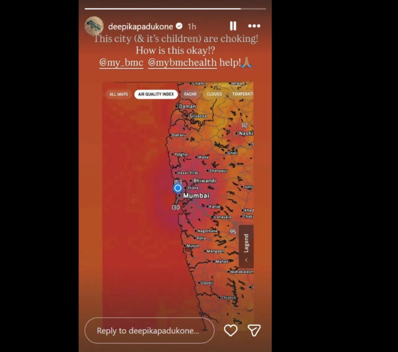 दीपिका पादुकोण ने गुरुवार को अपने इंस्टाग्राम स्टोरी पर एयर क्वालिटी इंडेक्स (AQI) का एक स्क्रीनशॉट शेयर किया। इस स्क्रीनशॉट में मुंबई के कई इलाकों में खराब वायु गुणवत्ता दिखाई दे रही थी।