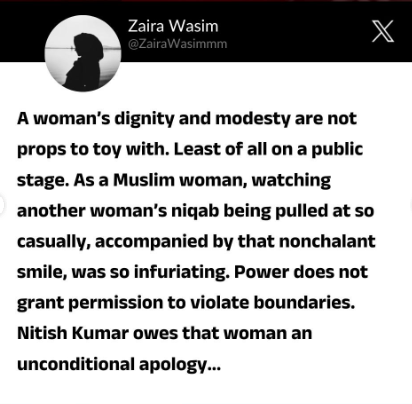 जायरा वसीम ने सोशल मीडिया पर पोस्ट साझा करते हुए लिखा, “महिलाओं की गरिमा और मर्यादा से खिलवाड़ नहीं किया जा सकता, खासकर सार्वजनिक मंच पर। एक मुस्लिम महिला होने के नाते, दूसरी मुस्लिम महिला का नकाब इतनी लापरवाही से हटाना और इसके साथ मुस्कान दिखाना बेहद आक्रोशजनक है। सत्ता सीमाओं का उल्लंघन करने की अनुमति नहीं देती। नीतीश कुमार को उस महिला से बिना शर्त माफी मांगनी चाहिए।”