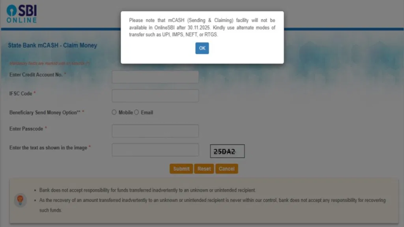 KNEWS DESK- भारतीय स्टेट बैंक (SBI) ने घोषणा की है कि वह 30 नवंबर, 2025 के बाद ऑनलाइनएसबीआई और योनो लाइट प्लेटफॉर्म पर mCash भेजने और क्लेम करने की सुविधा बंद कर देगा। इसका मतलब है कि ग्राहक बिना बेनिफिशरी रजिस्ट्रेशन के पैसे भेजने या mCash लिंक/ऐप के जरिए फंड का क्लेम करने में सक्षम नहीं होंगे।
