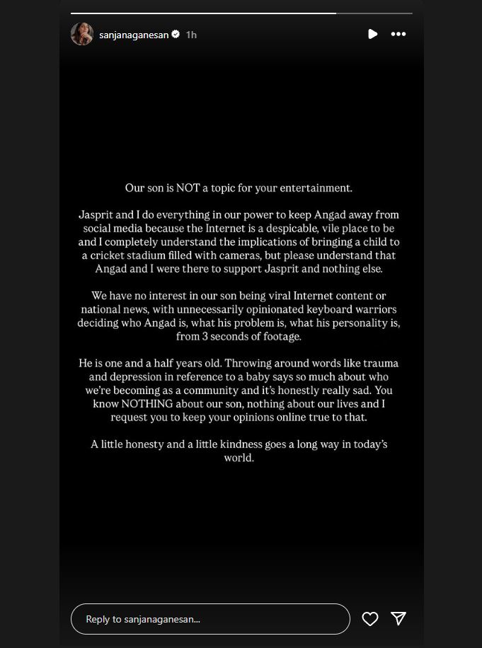 जसप्रीत और मैं अंगद को सोशल मीडिया से दूर रखने के लिए हर संभव प्रयास करते हैं क्योंकि इंटरनेट एक घृणित, घिनौना स्थान है और मैं एक बच्चे को कैमरों से भरे क्रिकेट स्टेडियम में लाने के निहितार्थों को पूरी तरह से समझता हूं, लेकिन कृपया समझें कि अंगद और मैं जसप्रीत का समर्थन करने के लिए वहां थे और कुछ नहीं।