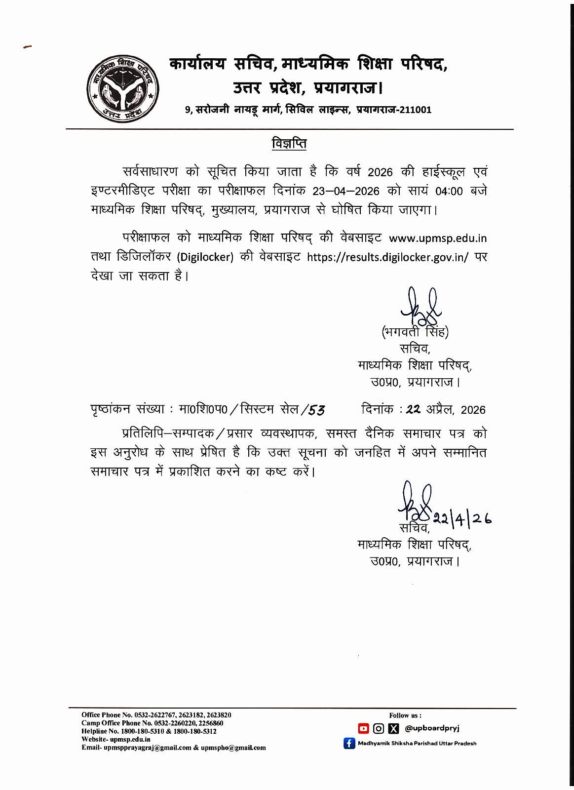 उत्तर प्रदेश माध्यमिक शिक्षा परिषद (UPMSP) ने यूपी बोर्ड 10वीं और 12वीं परीक्षा 2026 के परिणाम को लेकर बड़ा अपडेट जारी किया है। बोर्ड ने आधिकारिक रूप से घोषणा की है कि हाईस्कूल और इंटरमीडिएट दोनों के परिणाम 23 अप्रैल 2026, गुरुवार को शाम 4 बजे जारी किए जाएंगे। यह रिजल्ट प्रयागराज स्थित यूपी बोर्ड मुख्यालय से घोषित किया जाएगा।