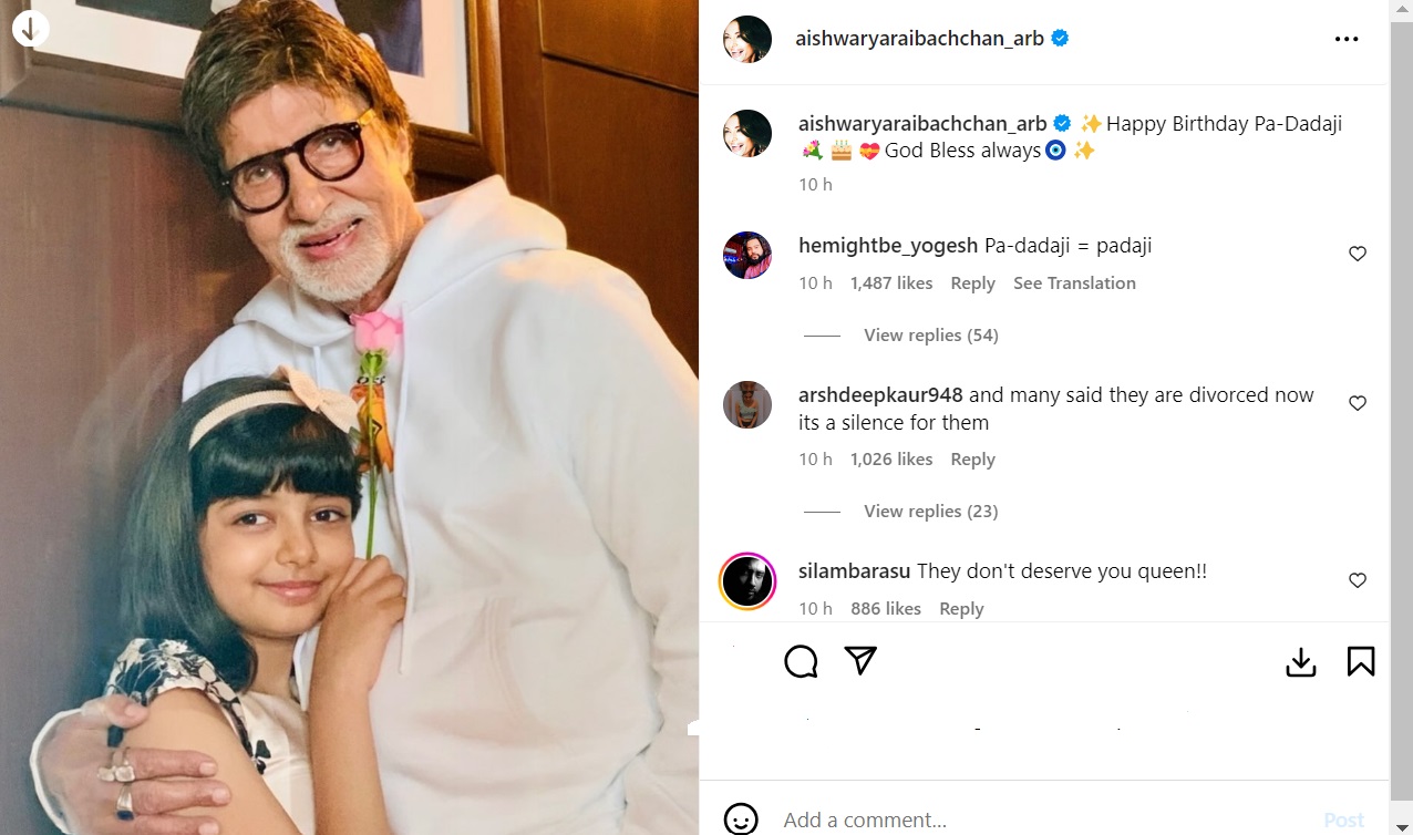 ऐश्वर्या ने फोटो के साथ कैप्शन लिखा, “हैप्पी बर्थडे पा-दादाजी, भगवान का आशीर्वाद हमेशा बना रहे।” यह संदेश साफ तौर पर दर्शाता है कि परिवार में सब कुछ ठीक है और उन्होंने किसी भी तरह की गलतफहमी को दूर कर दिया है। इस पोस्ट के बाद से बच्चन परिवार में तनाव की खबरों पर फुल स्टॉप लग गया है।