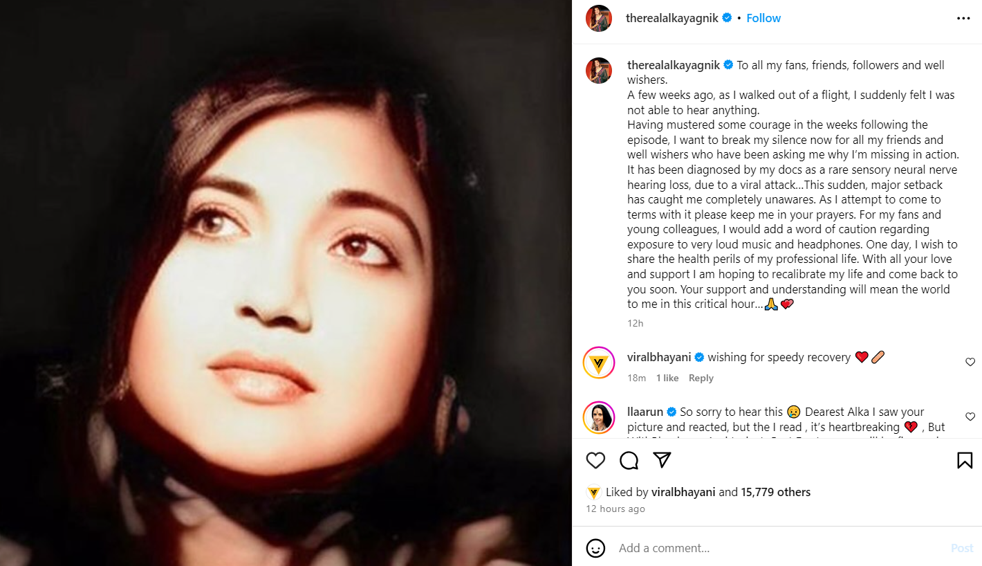 अल्का याग्निक ने कहा कि मेरे डॉक्टरों ने इसे वायरल अटैक के कारण रेयर सेंसरी न्यूरो नर्व हियरिंग लॉस डाइग्नोस किया है। इस अचानक, बड़े झटके ने मुझे पूरी तरह से चौंका दिया है। मैं इससे उबरने का प्रयास कर रही हूँ, कृपया मुझे अपनी प्रार्थनाओं में शामिल करें।