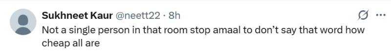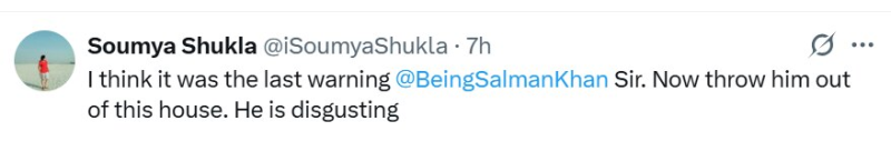 अमाल के साथ मौजूद तान्या, शहबाज और नेहल को भी फैंस ने जिम्मेदार ठहराया क्योंकि उन्होंने उसे रोकने में कोई पहल नहीं की। एक यूजर ने लिखा, “उस कमरे में एक भी व्यक्ति ने अमाल को ये शब्द कहने से नहीं रोका, सब कितने घटिया हैं।”