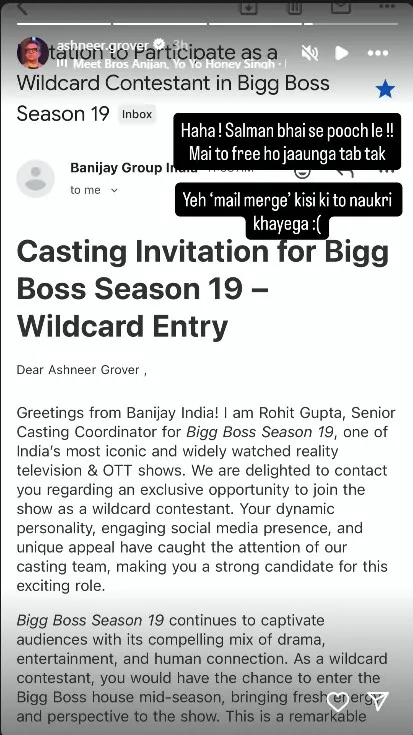 अशनीर ग्रोवर ने खुद सोशल मीडिया पर एक स्क्रीनशॉट शेयर करते हुए यह खुलासा किया कि उन्हें Banijay इंडिया ग्रुप की ओर से ‘बिग बॉस 19’ में बतौर वाइल्ड कार्ड एंट्री लेने का ऑफर मिला है। मेल में लिखा गया था कि उनकी पर्सनालिटी, सोशल मीडिया प्रेजेंस और यूनिक अपील को देखते हुए शो के सीनियर कास्टिंग डायरेक्टर ने उन्हें कैंडिडेट के तौर पर चुना है।