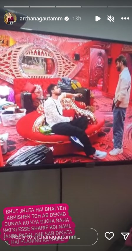 अर्चना ने अपनी इंस्टाग्राम स्टोरी पर ‘बिग बॉस 17’ की लाइव फीड के मोमेंट्स दिखाए हैं, जिसमें अभिषेक, मुनव्वर से ईशा के बारे में बात करते हुए दिख रहे हैं| वीडियो के साथ बैकग्राउंड में अर्चना की आवाज आती है| वह कहती हैं, कितना झूठ बोलेगे? तुमने ही तो कहा था कि ईशा आ रही है| अब खुद कह रहे हो कि मुझे नहीं पता, ईशा आ रही है| आप दुनिया से झूठ क्यों बोल रहे हैं? क्या तुम भूल गए कि तुमने क्या कहा था- अरे यार, मेरी एक्स गर्लफ्रेंड ईशा भी आ रही है|