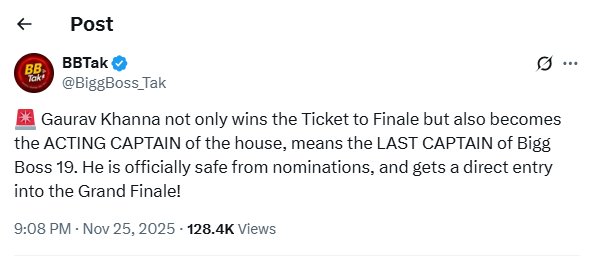 बिग बॉस के पॉपुलर फैन पेज ‘बीबी तक’ की रिपोर्ट के अनुसार, ‘टिकट टू फिनाले’ टास्क में गौरव खन्ना ने शानदार जीत दर्ज की है। इसके साथ ही वे न केवल सीजन के पहले फाइनलिस्ट बन गए हैं, बल्कि घर के आखिरी कैप्टन भी बन चुके हैं।