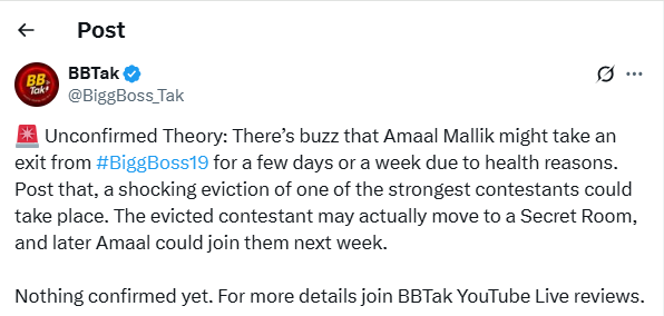 शो से जुड़ी एक और बड़ी खबर यह है कि अमाल मलिक की तबीयत ठीक नहीं है, और वह कुछ समय के लिए घर से बाहर जा सकते हैं. सोशल मीडिया पर उनके पिता डब्बू मलिक का एक ट्वीट वायरल हो रहा है, जिसमें उन्होंने लिखा – “28 को बाहर मिलते हैं”. हालांकि उन्होंने किसी का नाम नहीं लिया, लेकिन फैन्स का मानना है कि ये ट्वीट अमाल के अस्थायी एग्ज़िट की ओर इशारा करता है. बताया जा रहा है कि हेल्थ ठीक होने के बाद अमाल फिर से शो में एंट्री लेंगे.
