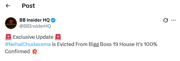 सूत्रों के अनुसार, इस हफ्ते एक सदस्य को दर्शक वोट्स के जरिए बाहर करेंगे, जबकि दूसरे कंटेस्टेंट को घरवाले मिलकर वोट आउट करेंगे. रिपोर्ट्स की मानें तो पहला एविक्टेड कंटेस्टेंट नेहल चुडासमा होंगी, जिन्हें ऑडियंस से सबसे कम वोट मिले हैं.