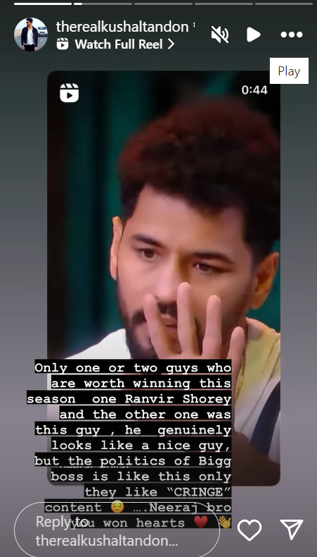 अपने इस पोस्ट में कुशाल टंडन ने कैप्शन में लिखा- सिर्फ एक या दो लोग हैं, जो इस सीजन को जीतने के लायक हैं, एक रणवीर शौरी और दूसरा नीरज गोयत था| वो सच में एक अच्छा लड़का लगता है लेकिन बिग बॉस की पॉलिटिक्स ही ऐसी है, उन्हें सिर्फ क्रिंग कंटेंट ही पसंद है| नीरज भाई तुमने दिल जीत लिया| बता दें कि कुशाल टंडन भी बिग बॉस सीजन 7 में नजर आए थे|