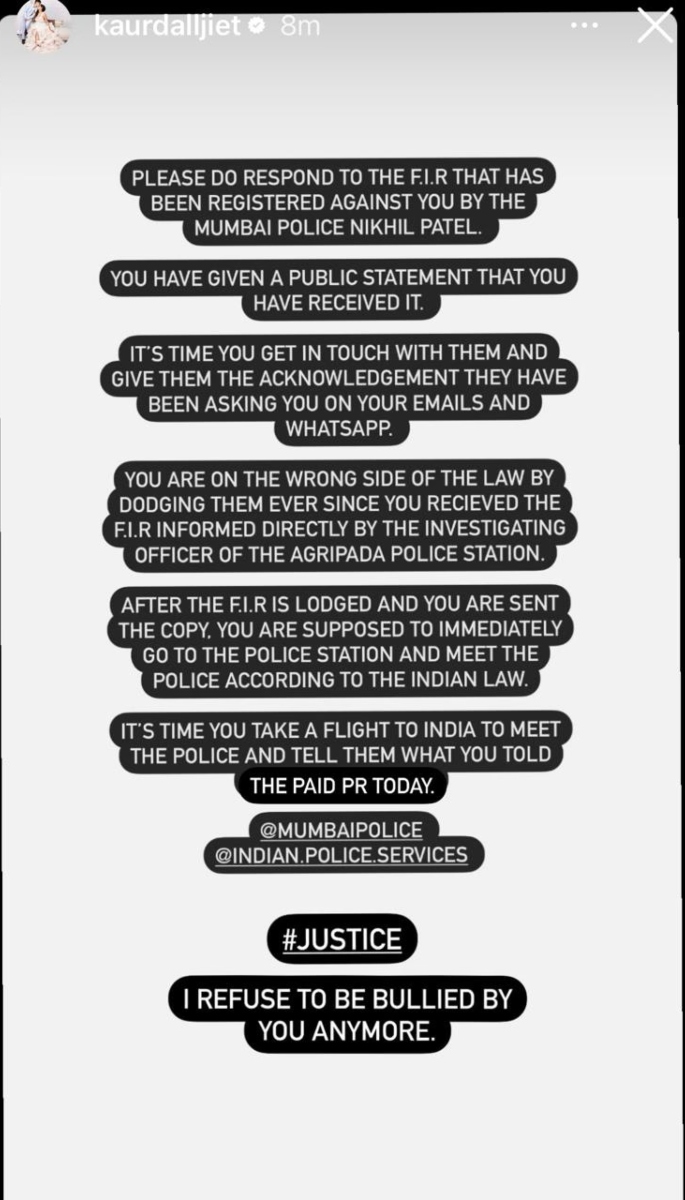 दलजीत ने अपने पोस्ट में लिखा, निखिल पटेल, मुंबई पुलिस ने आपके खिलाफ जो एफआईआर दर्ज की है, उस पर कृपया प्रतिक्रिया दें| आपने एक सार्वजनिक बयान दिया है कि आपको यह मिल गया है| अब समय आ गया है कि आप उनसे संपर्क करें और उन्हें वह स्वीकारोक्ति दें जो उनके पास है| मैं आपसे आपके ईमेल और व्हाट्सएप पर पूछ रही हूं|
