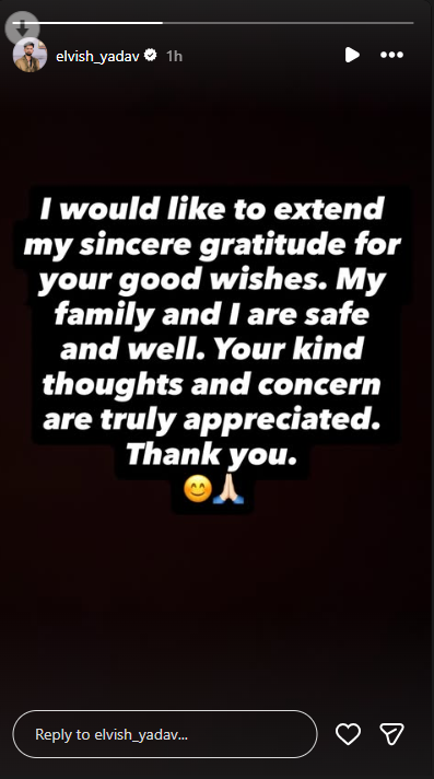 घटना के कुछ घंटे बाद एल्विश यादव ने अपने इंस्टाग्राम अकाउंट पर एक स्टोरी पोस्ट की। उन्होंने लिखा, “आप लोगों की प्रार्थना और गुड विशेज के लिए दिल से धन्यवाद। मैं और मेरा परिवार सुरक्षित और स्वस्थ हैं। आपके प्यार और चिंता के लिए आभारी हूं।” एल्विश की इस पोस्ट के बाद उनके फैंस ने राहत की सांस ली।